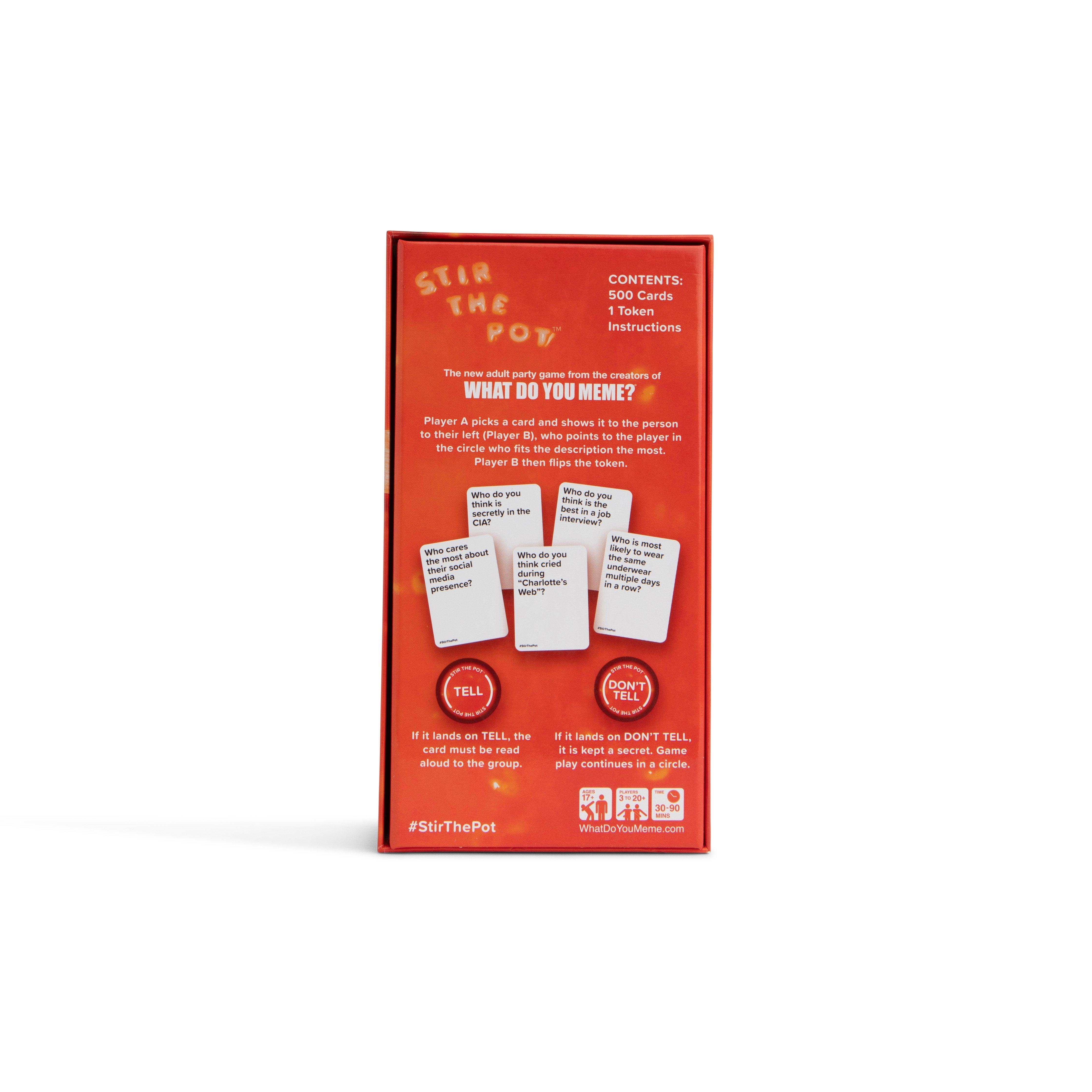 What Do You Meme? Stir The Pot Adult Party Game Stir The Pot This game is for ages 17+ Stir The Pot will make game night unforgettable. That means it's time to let your guard down and let the good roasts roll. Pro-tip: If you say "no offense" before the game starts, nothing you say after can be held against you! What's inside? 500 cards ;