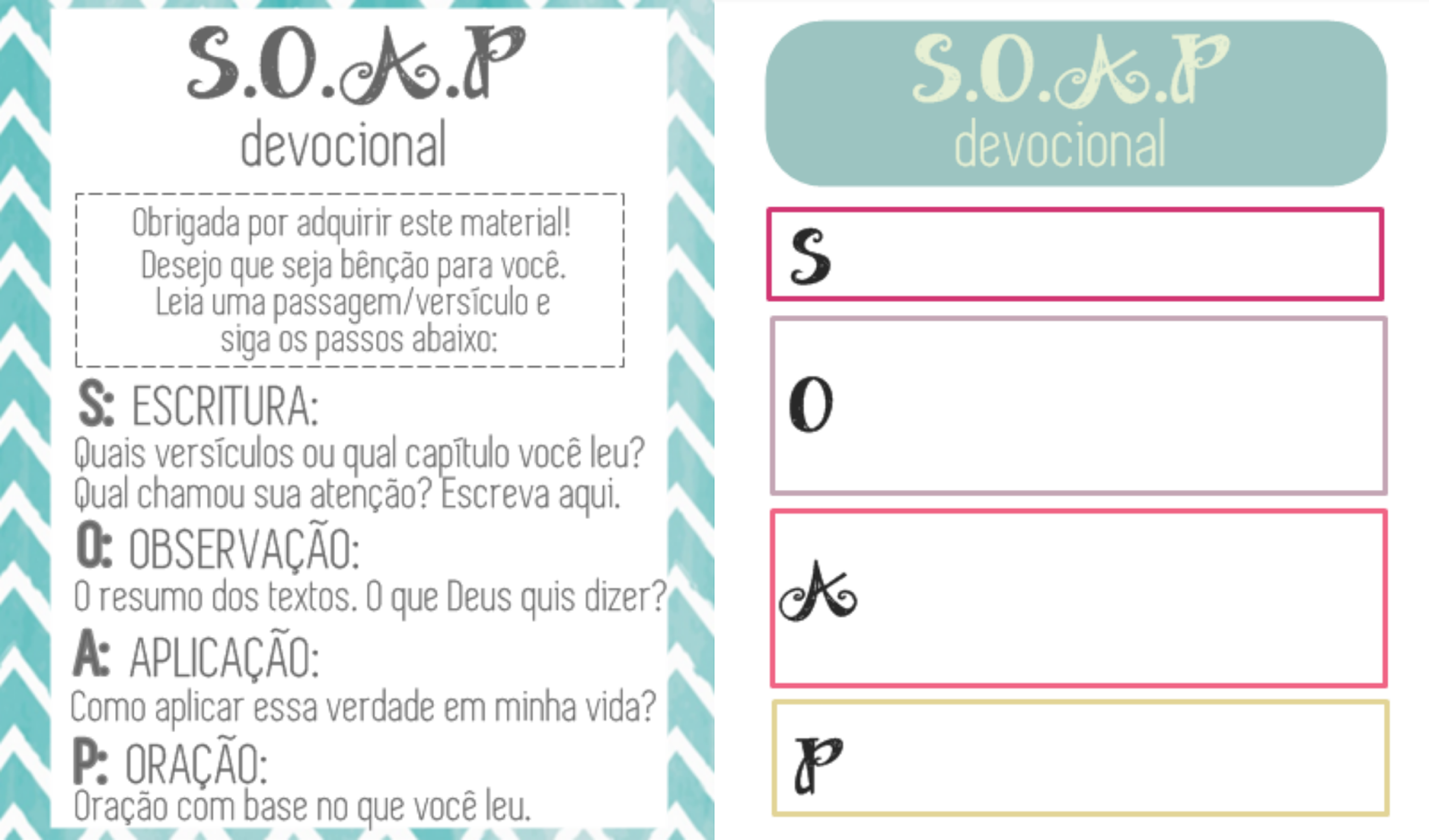Meu Diário Cristão M. S DEVOCIONAL RAPIDO E FACIL MÉTODO SOAP Eu não sigo uma regra ou método específico, gosto da liberdade de poder fazer cada dia de uma forma diferente. Por exemplo, um dia eu faço devocional usando o famoso método S.O.A.P., outro dia eu só escrevo um versículo e o que Deus falou comigo, outro faço só um lettering do versículo, outro escrevo uma oração, enfim, não há regras, eu faço aquilo que eu mais sentir vontade no.