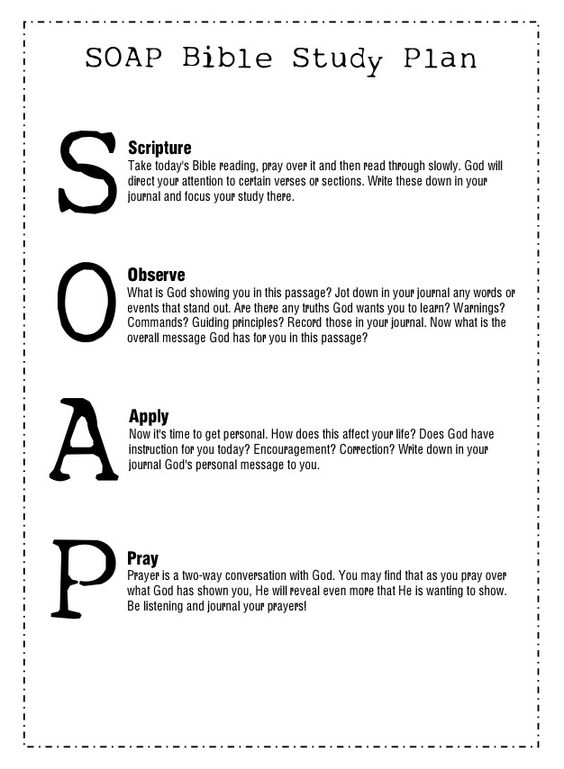 SOAP bible study method info graphic plus free printable! Bible study SOAP Method. SOAP Method. S.O.A.P. is a method of Bible reading and journaling. It can be used with any daily Bible reading plan. First of all, Pray for God to help you concentrate and learn what he has to say to you. S for Scripture. Open your Bible to today's reading. Take time reading and allow God to speak to you.