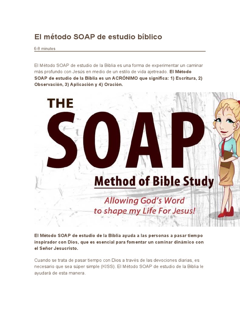 Metodo de Estudio Devocional Biblia Oración El Método de Estudio Bíblico SOAP es un marco simple pero poderoso que lo alienta a profundizar en la Palabra de Dios. Este proceso fácil de seguir consta de cuatro componentes clave: Escritura, observación, aplicación y oración .