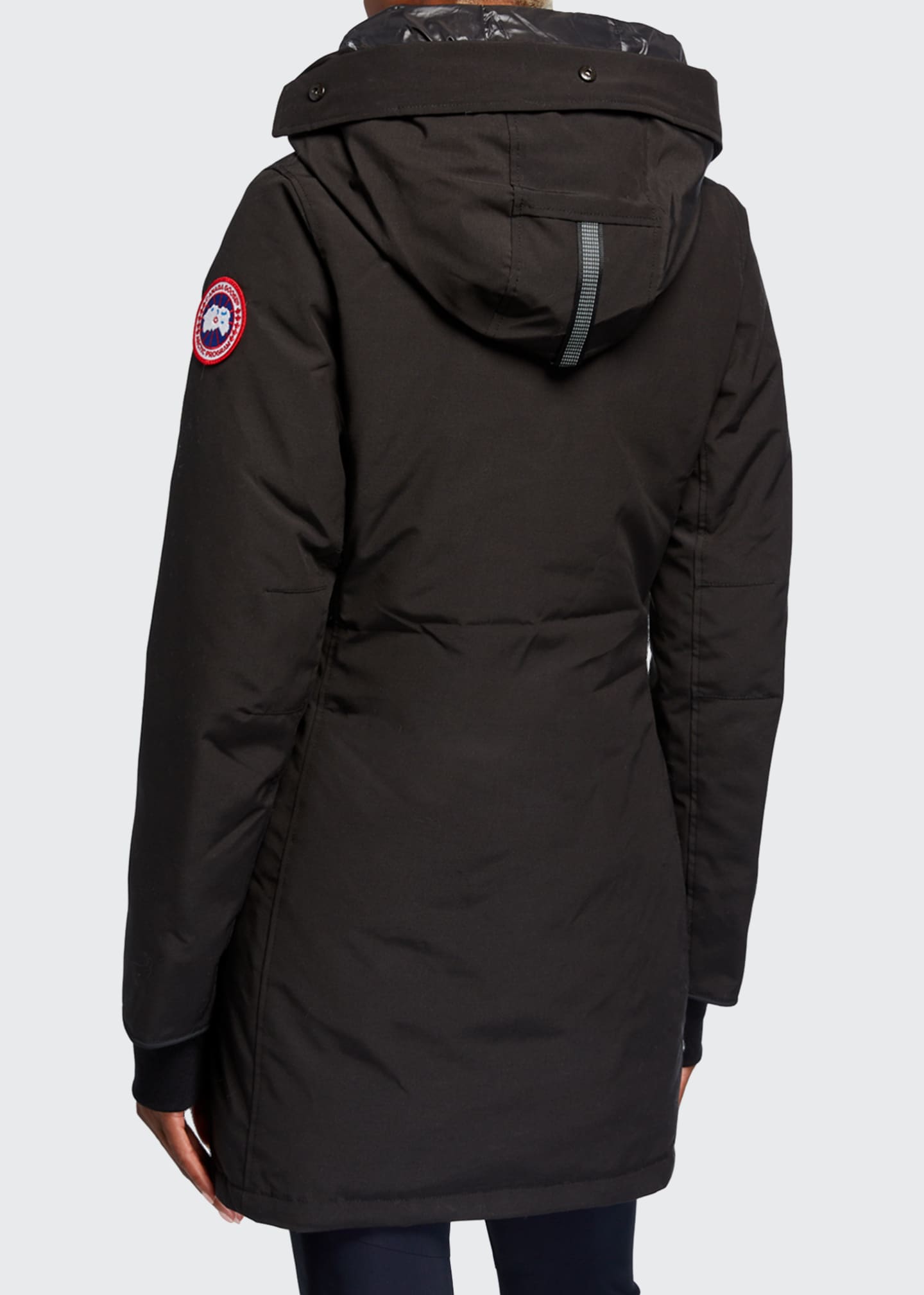 Canada Goose Black Down Rosemont Parka Canada Goose Description The slim-fit Rosemont Parka has a streamlined look and feel - perfect for daily wear. It features backpack straps for hands-free carrying when temperatures rise, and reflective details behind the hood for visibility in low light. Shipping & Returns Limited Warranty