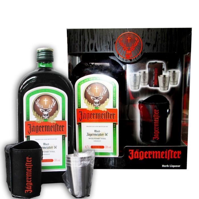 JAGERMEISTER COFFRET AVEC VERRES Achat / Vente digestif eau de vie JAGERMEISTER COFFRET AVEC Jägermeister est une liqueur allemande élaborée à partir de 56 herbes, racines, épices, fleurs, fruits et plantes en provenance des quatre coins du monde. Créée à l'origine pour les chasseurs, c'est LA liqueur authentique et inimitable depuis 1878.