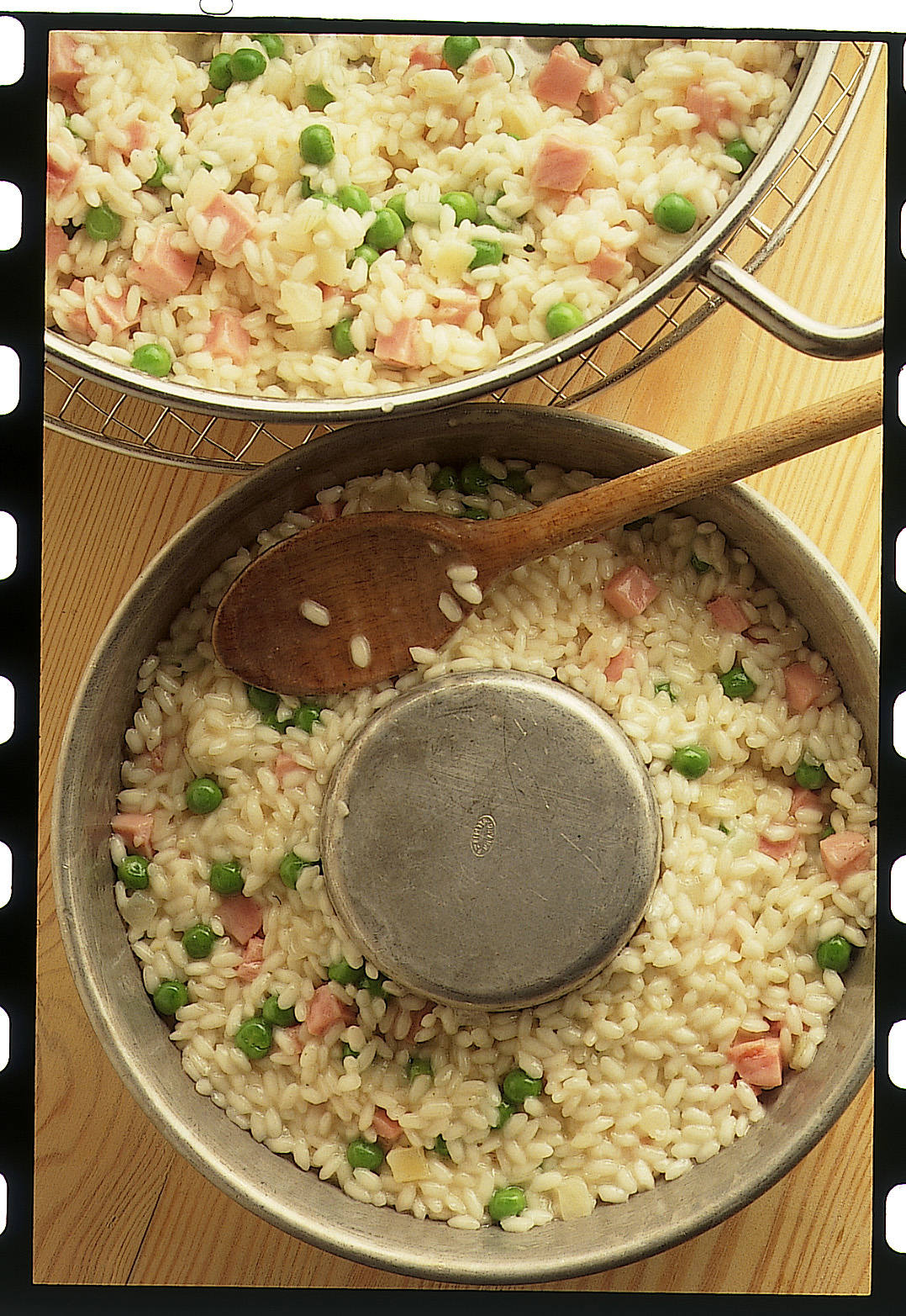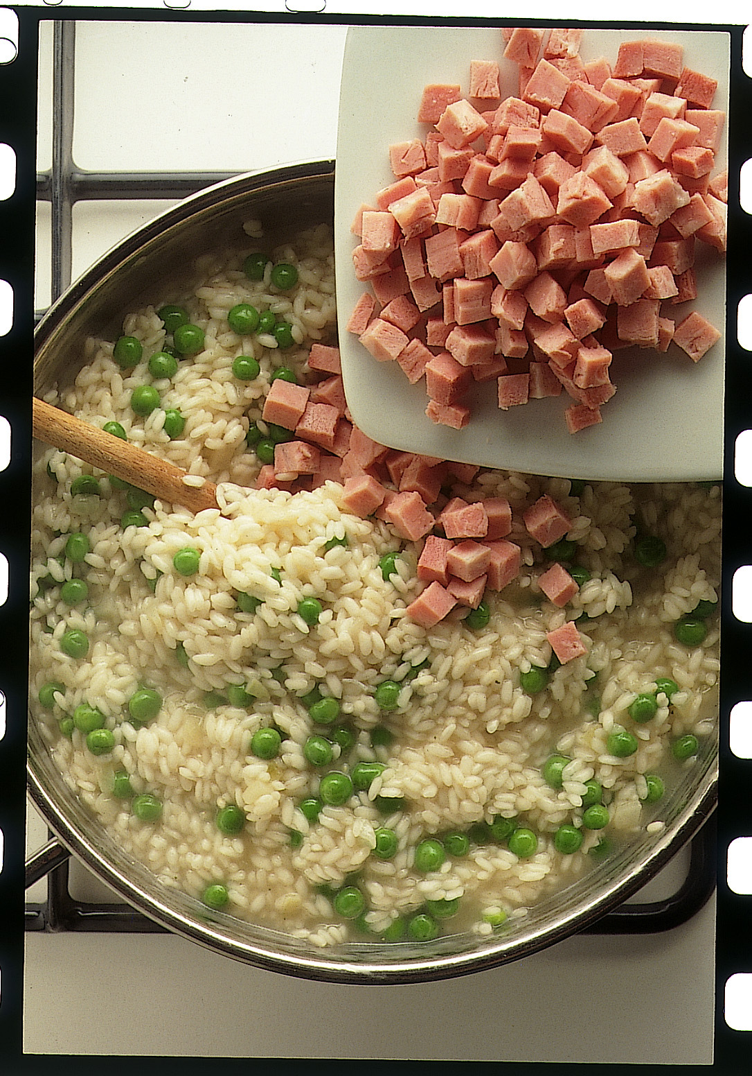 Anello di riso e prosciutto Cucina In Forma Ingredienti per 4 persone ingredienti Anello di Riso. gr. 320 di riso, gr. 50 di funghi secchi, gr. 150 di prosciutto cotto tagliato alto 1 centimeto, gr. 300 di piselli surgelati, gr. 80 di burro, gr. 50 di formaggio grattugiato, 1 cipolla, 1 bicchiere di vino bianco secco, brodo di dado, noce moscata, cannella, sale e pepe quanto basta