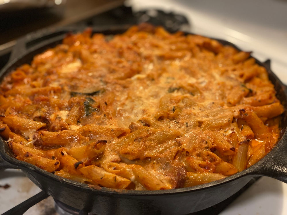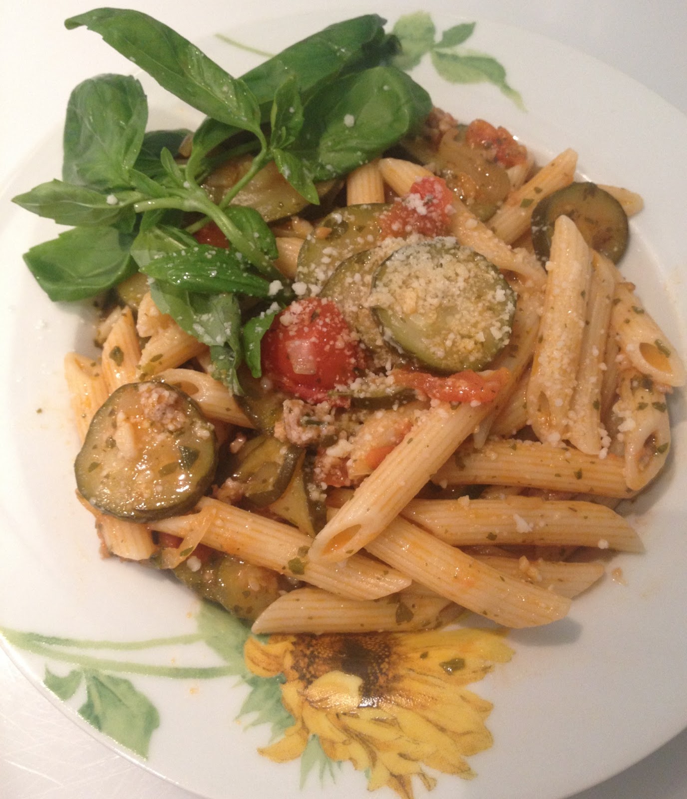 Penne panna funghi salsiccia e zucchine Ma petite cuisine Add onion and saute until soft and translucent, about 3 minutes. Add garlic and saute 1 minute more. Drain off and discard any excess fat. Add the tomatoes, basil, oregano, parsley, crushed red pepper, and salt. Stir in mushrooms and pasta sauce. Bring to a boil, then reduce heat to medium-low. Stir in cooked pasta and top with Parmesan cheese.