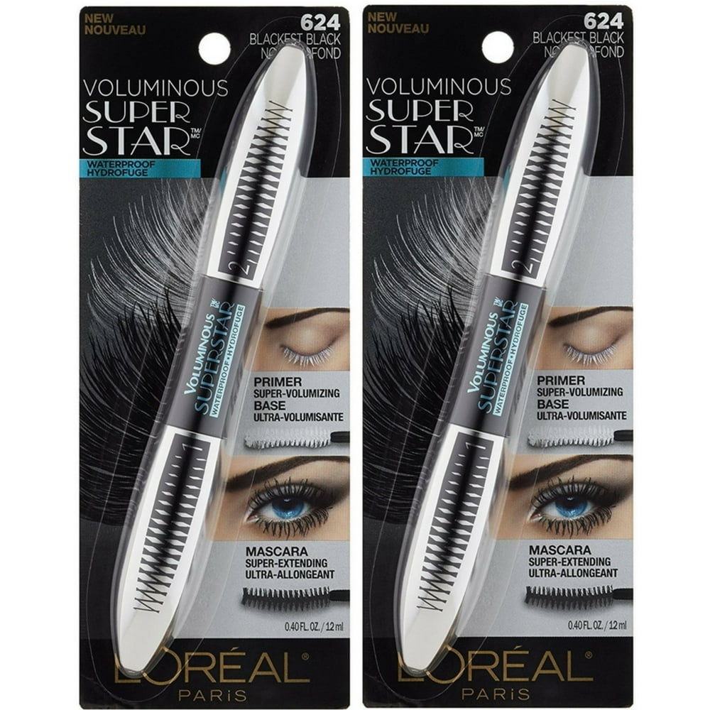 L'Oreal Paris Voluminous Superstar Waterproof Mascara, Blackest Black [624] 0.40 oz (Pack of 2 L'Oreal Paris Voluminous Superstar Mascara is a two-step primer and lengthening mascara for a show-stopping lash effect. Super-volumizing primer builds dramatic volume on every lash and creates an ultra smooth base to maximize mascara performance. Super-extending mascara with a fiber-rich black formula. Ingredients Usage Mascara Intense Volume