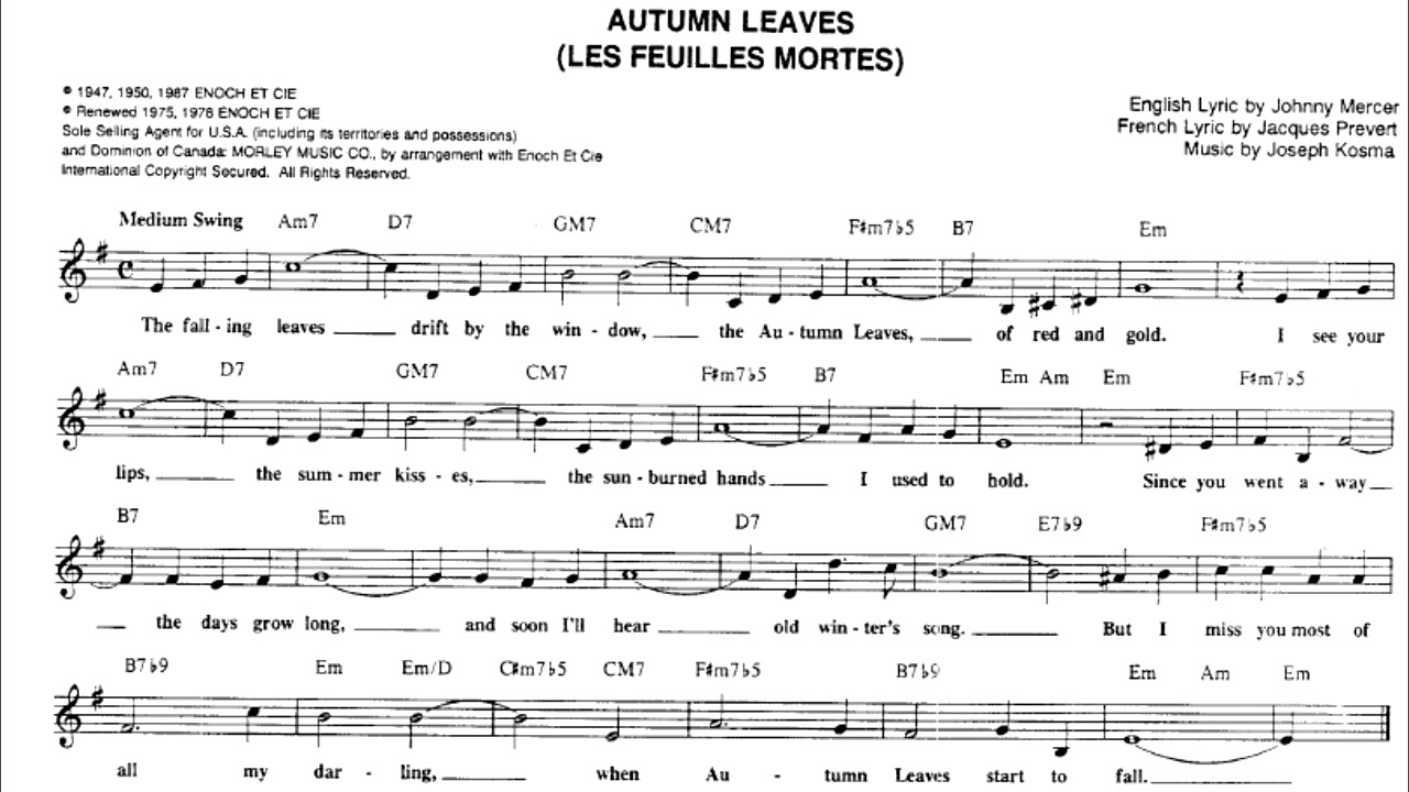 Autumn Leaves Backing track / Playalong Acordes Chordify Autumn Leaves - Backing Track. 1. AUTUMN LEAVES - PIANO excerpt. Autumn Leaves has become one of my community Choir's most popular songs - perhaps because we don't do many jazz standards, but also I think the wistful lines are quite evocative and help with marking the passing of another year. It starts with a basic unison verse then.